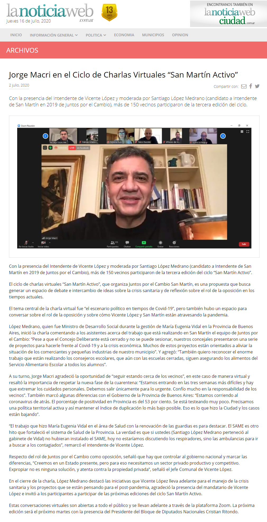 Jorge Macri en el Ciclo de charlas virtuales «San Martín Activo» Deja un comentario / Prensa Compartir: