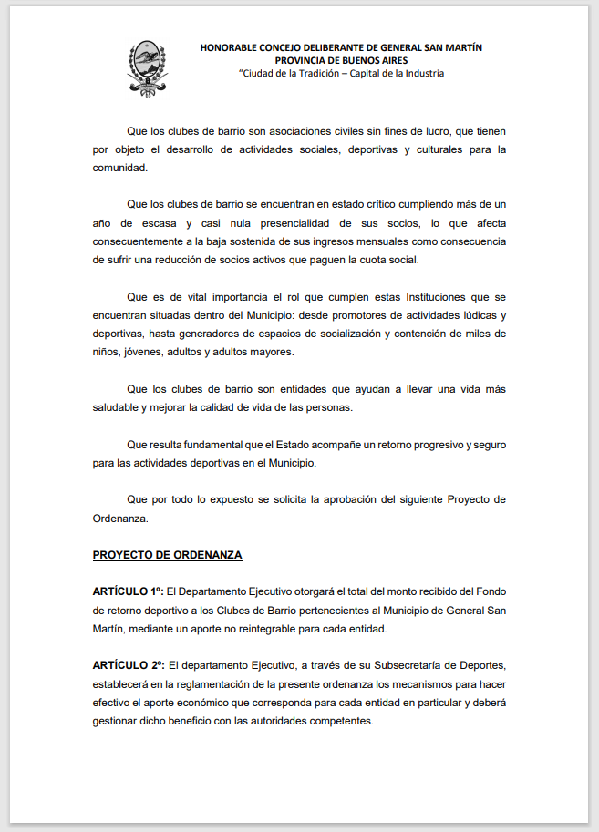El Bloque Juntos por el Cambio presentó, en el Honorable Concejo Deliberante de Gral. San Martín, un proyecto donde pide al Ejecutivo que otorgue el total del monto percibido del Fondo de retorno deportivo a los Clubes de Barrio pertenecientes al Municipio.